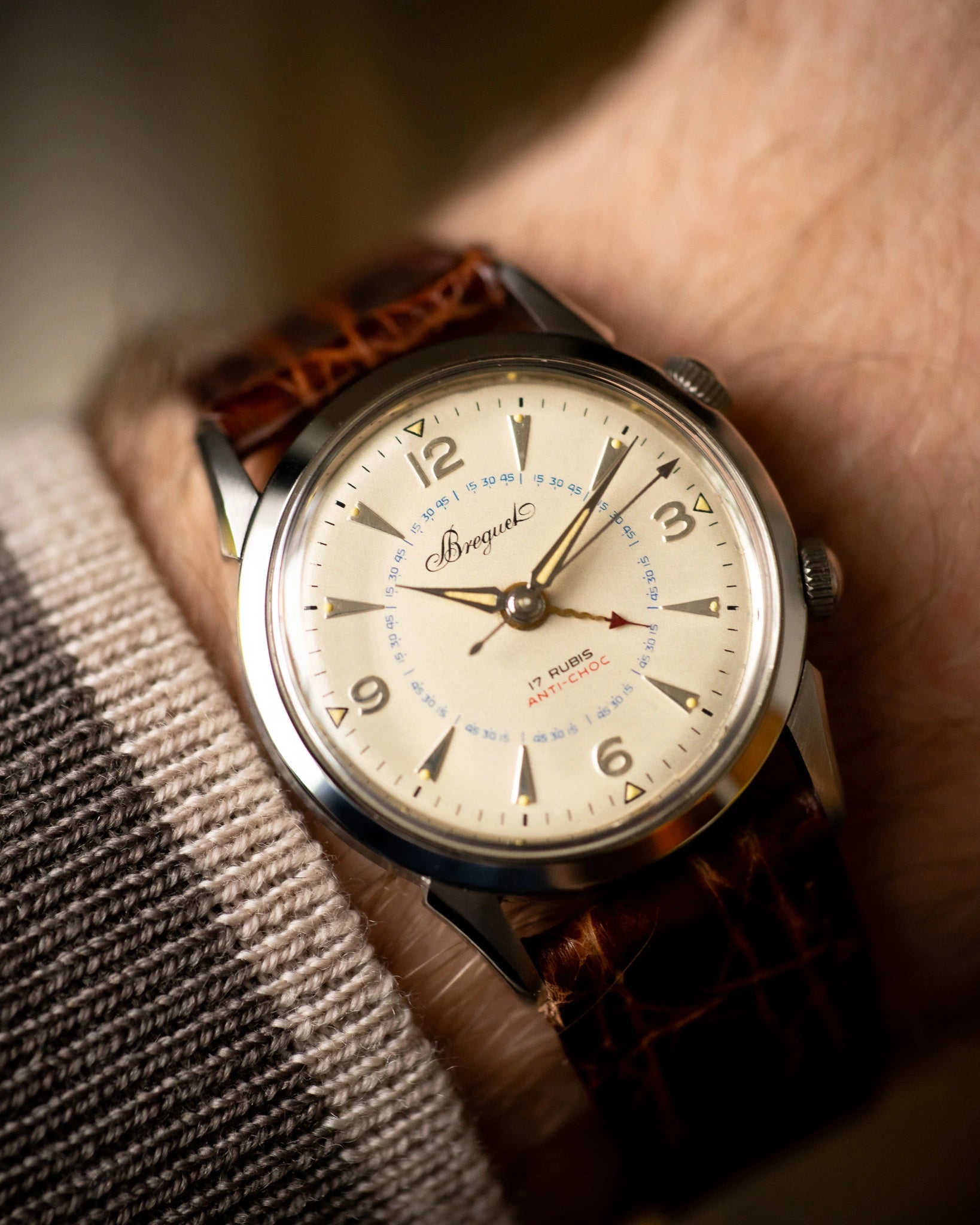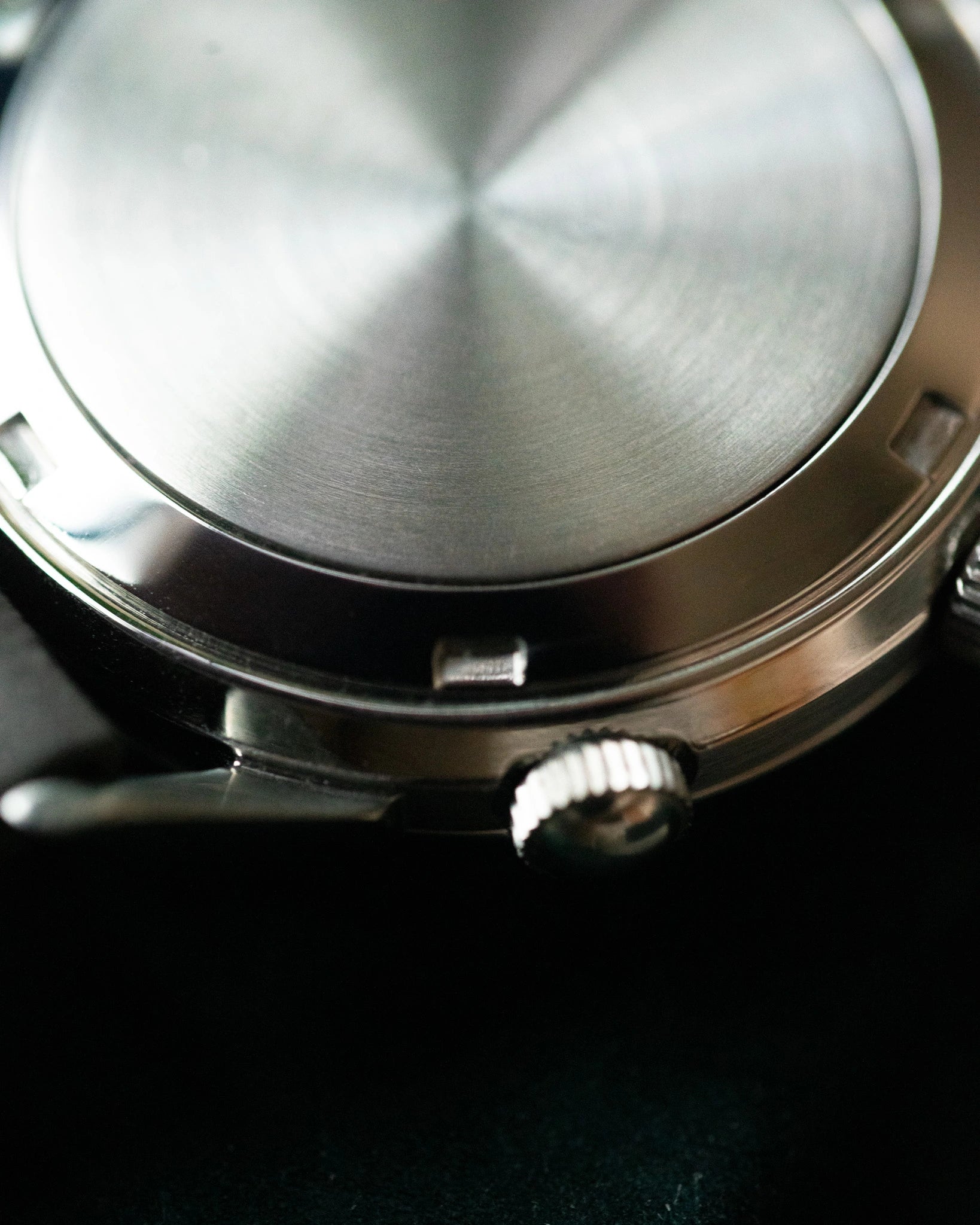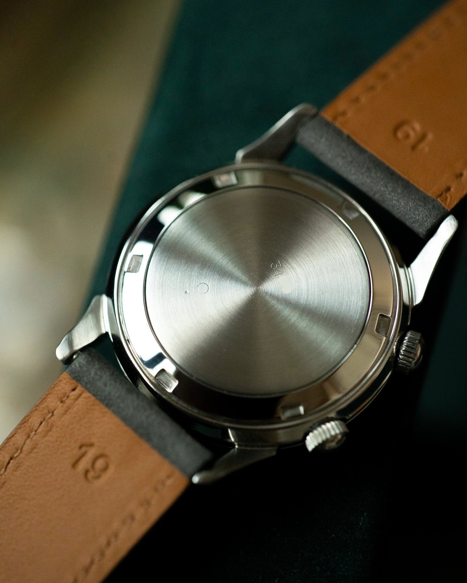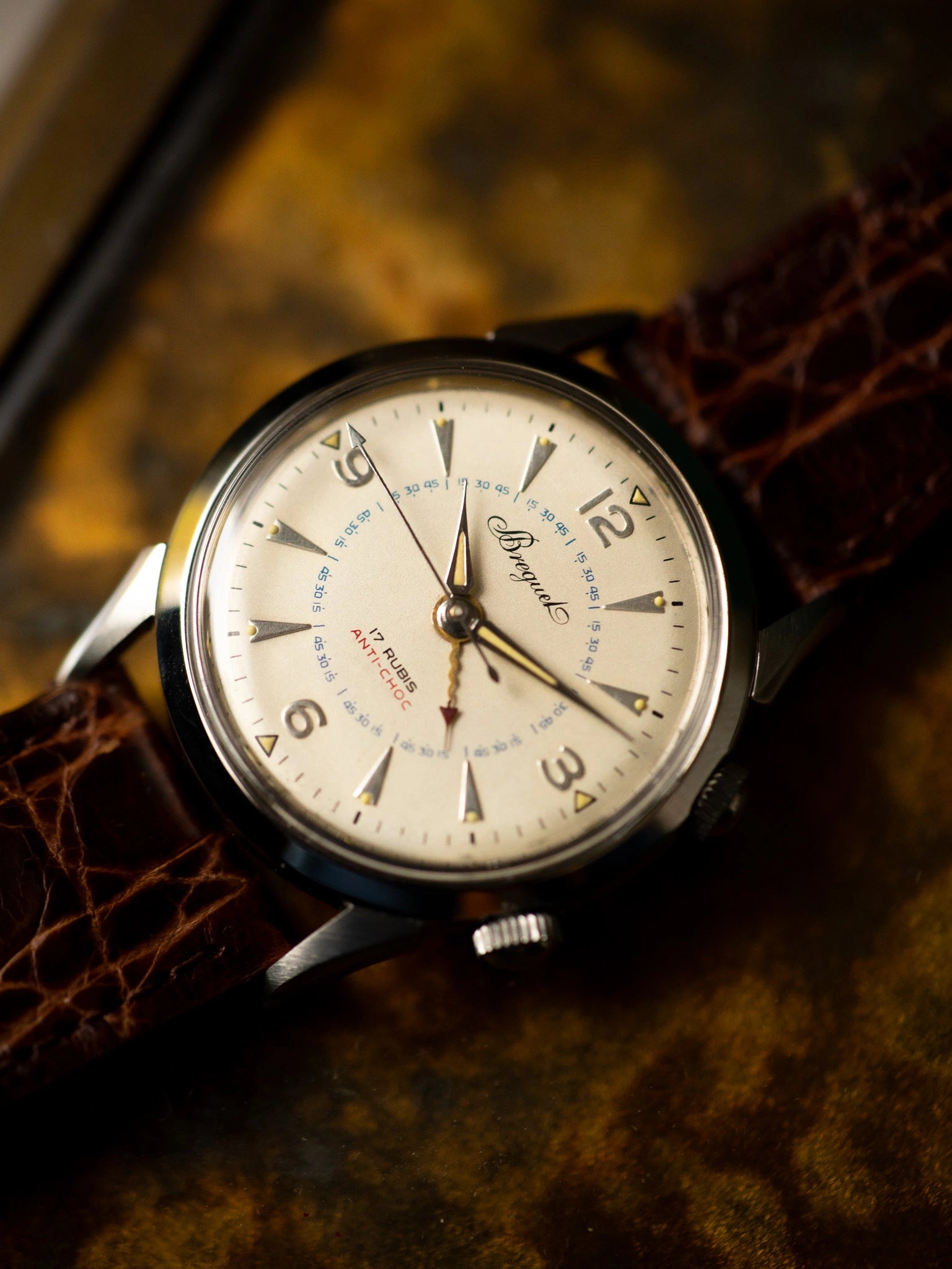 This exceptionally rare 1965 Breguet Diver with alarm is 1 of just 2 examples known. The exciting sporty design, an unusual rarity for Breguet in the period, features a 4 part stainless steel water resistant case with a two part caseback with screw down ring with gasket . The 11 1/2 lignes calibre 1475 AS movement is suspended for anti-shock protection as denoted by the beautiful dial, further adding to the watches sporty nature. The central seconds design and large indices provide excellent legibility whilst the second crown is used to set the golden serpentine hand to the quarters of the hour to set a soonerie alarm. Once the alarm is triggered hammers hit a gong in the form of a resonant tube affixed to the interior of the caseback, creating both a resonant tone and vibration to one’s wrist. This design can be seen carried to the modern collection in the Breguet Marine.